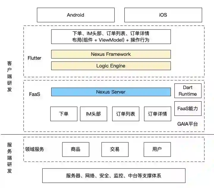 目前公司 FaaS 环境已经支持 Java、Kotlin、Swift、Dart、Node.js 等多种语言与框架,闲鱼通过 Android(Flutter)、iOS(Flutter)、FaaS(Dart Runtime)都使用Dart 达到语言一体,并且实现协议一体与工程一体。