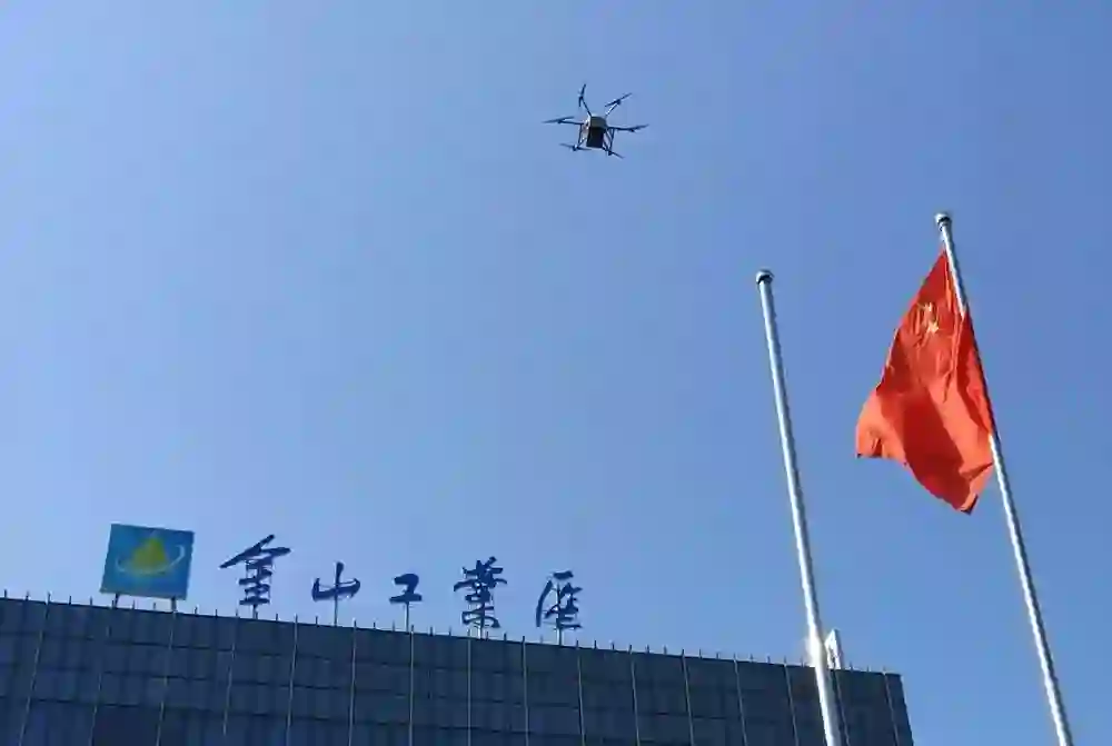 “迅蚁”无人机在上海金山工业区进行外卖配送。