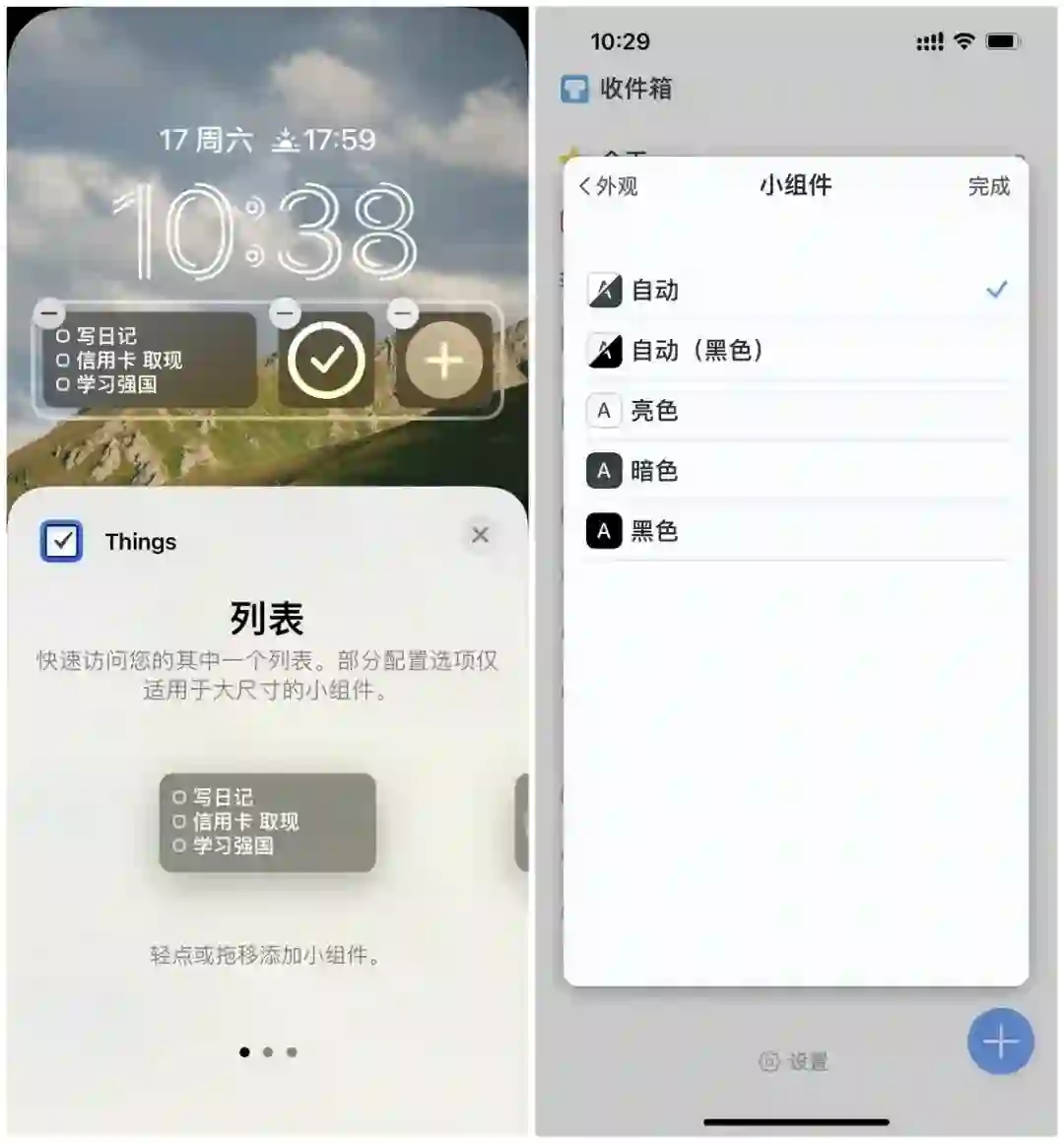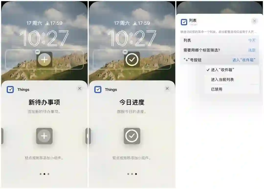 Things 是我个人最喜爱的一款待办事项工具,除了优秀的设计和简洁高效的任务管理理念,Things 对 iOS 系统新特性的适配也非常地及时。Things 的锁屏小组件总共有三种,分别为列表、新待办事项和今日进度三种,还可以在应用中选择小组件的外观。