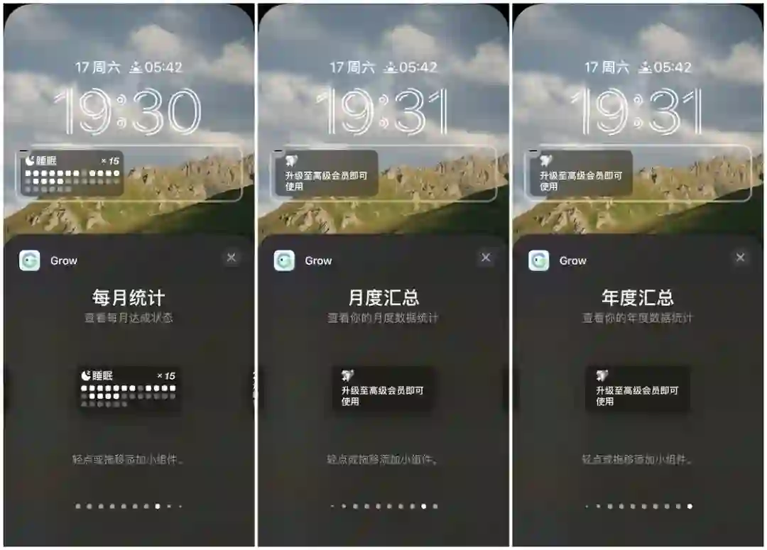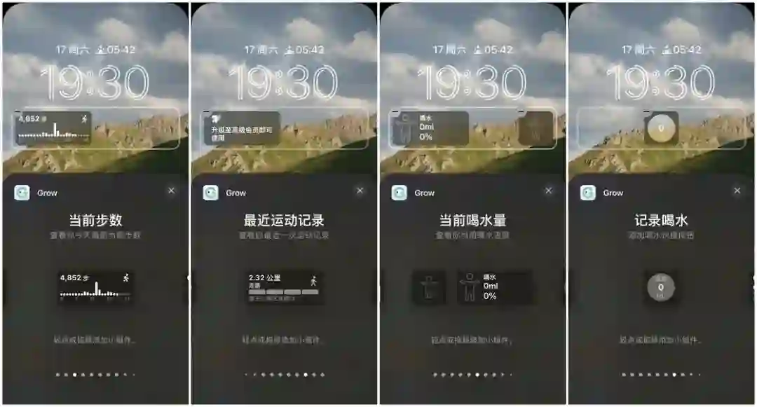 来介绍。Grow 提供的锁屏界面小组件种类繁多,总共有 11 种,其中今日进度和当前喝水量的小组件又分为了大、小两种尺寸,不过一部分需要 Pro 会员才可以解锁使用。