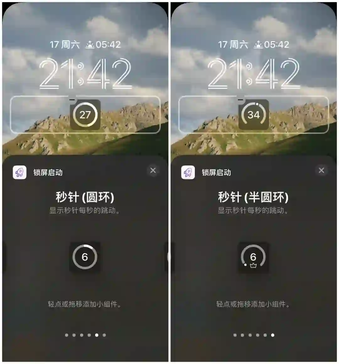 锁屏启动的小组件分为两种,一种是自定义功能的小组件,另一种则是秒针。秒针很好理解,就是在锁屏界面上显示秒钟数,提供了圆环和半圆环两种类型。
