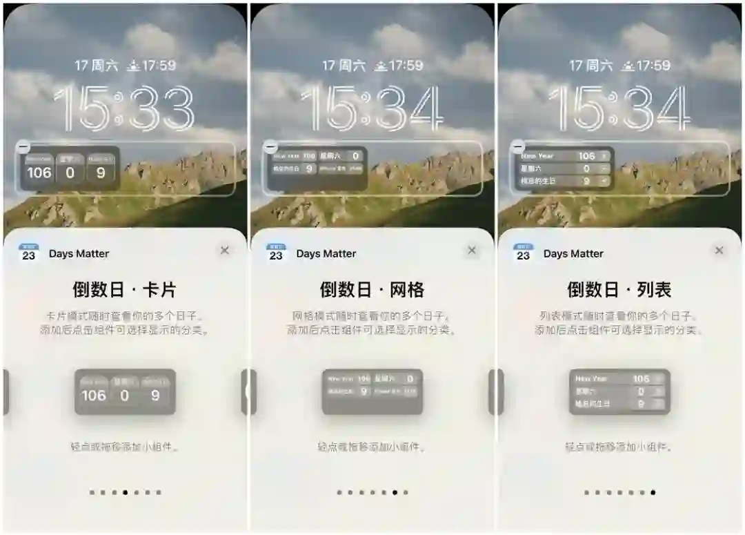 倒数日小组件则是展示效率更高的一种方法,它提供了卡片、网格和列表三种形式,可以在同样大小尺寸的小组件中展示更多的倒数日个数。