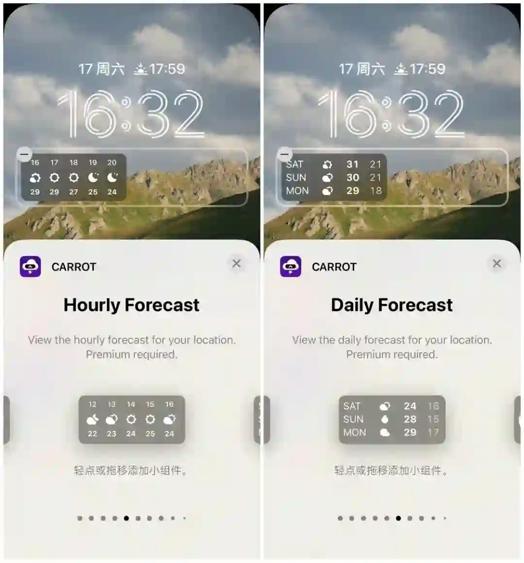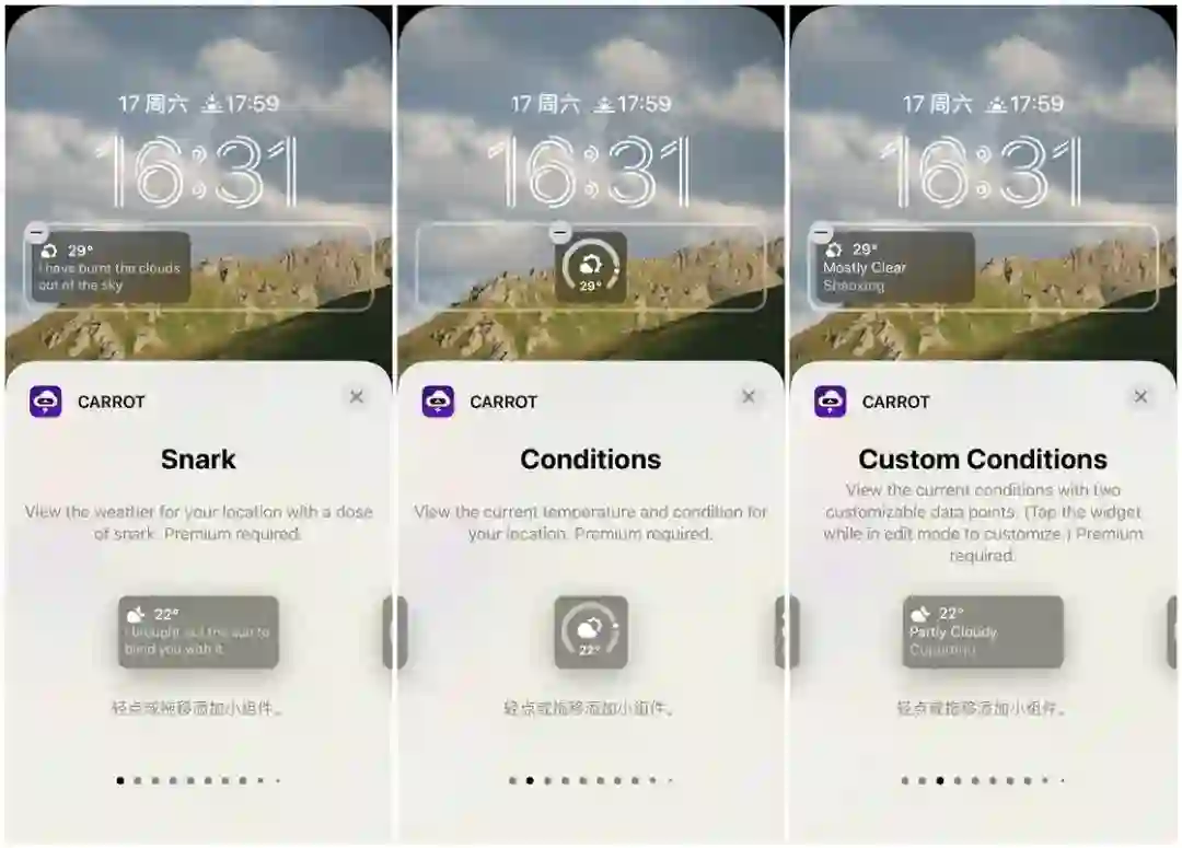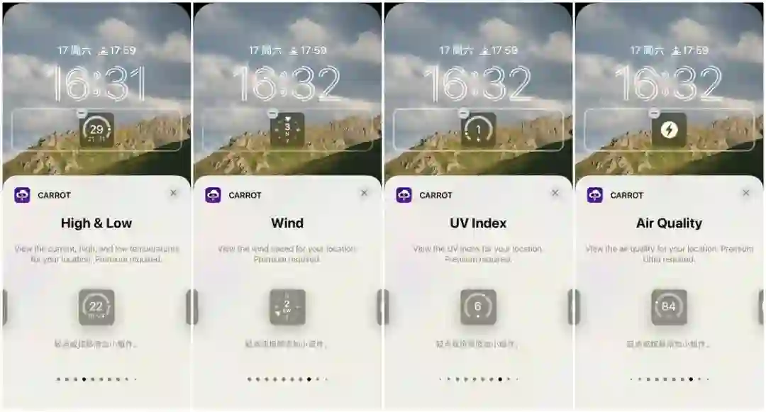 作为一款老牌的第三方天气 App,Carrot Weather 在本次锁屏小组件适配种提供了非常丰富的小组件类型,真可谓是眼花缭乱了。我将 Carrot Weather 的小组件分为了 4 种类型,分别为当前天气、天气预报、天气指标和自定义。