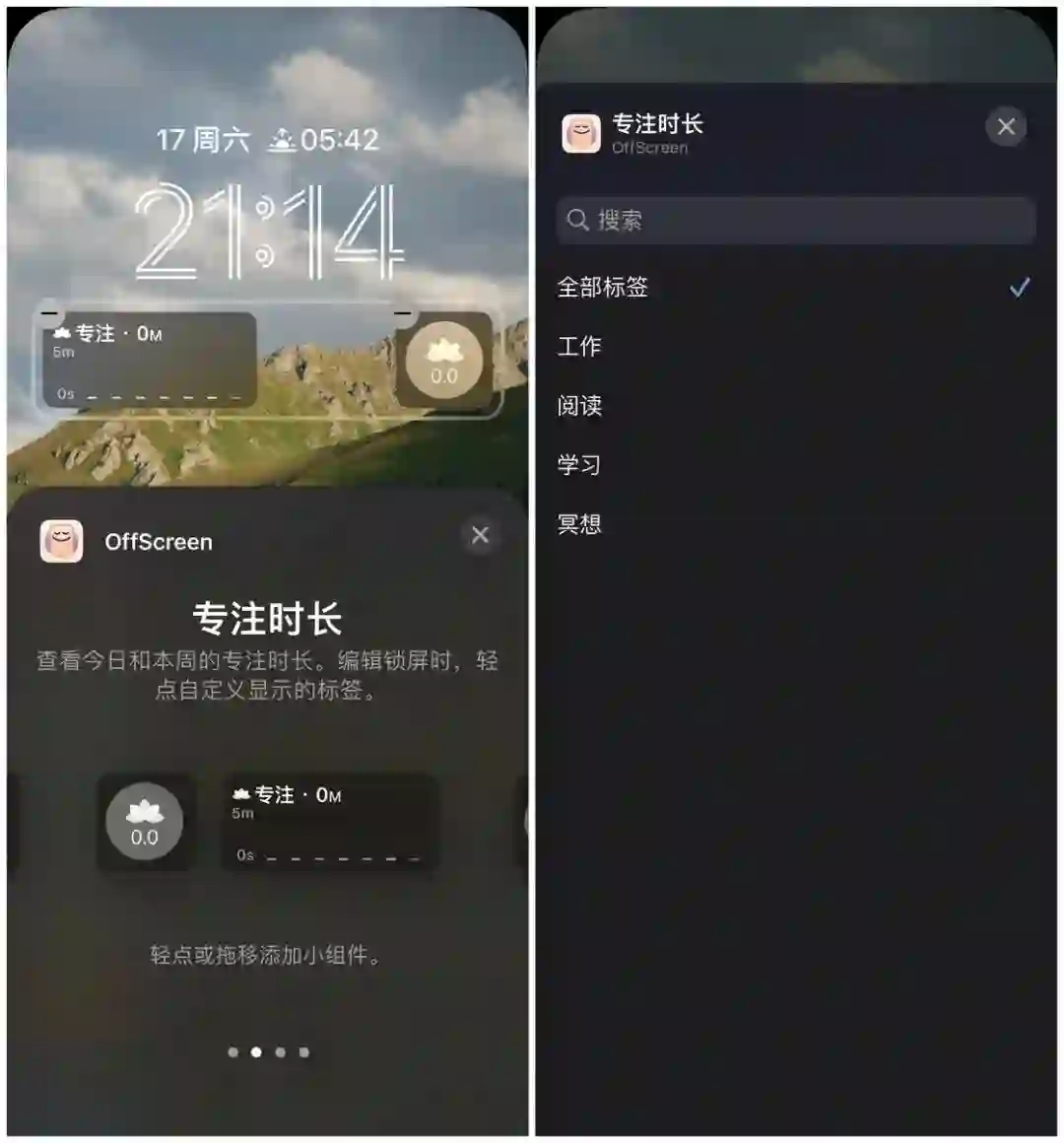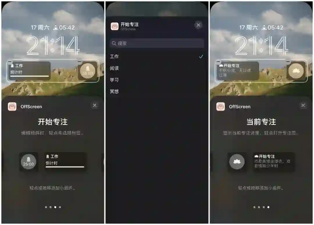 开始专注小组件可以让我在锁屏界面直接启动专注,还可以选择专注的标签。当前专注小组件显示当前专注进度,轻点则可以打开专注页。