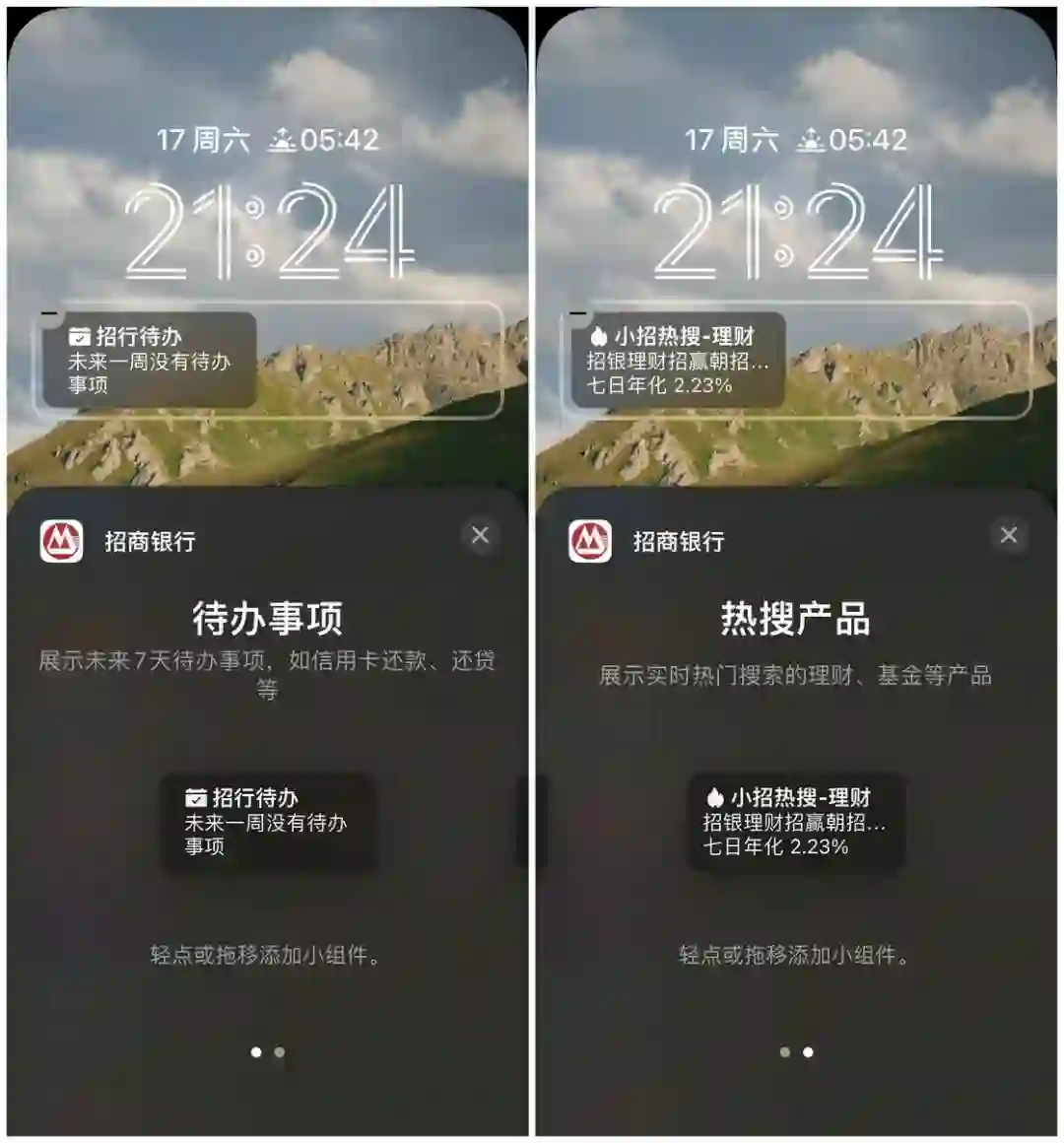 作为国内银行 App 中体验最佳的一家,招商银行也适配了锁屏界面的小组件。但是,招行的小组件只有两种,一种是待办事项,展示未来 7 天的待办事项,包括信用卡还款和还贷等,另一个热搜产品就不多说了,我相信应该没有人会摆到锁屏界面上。