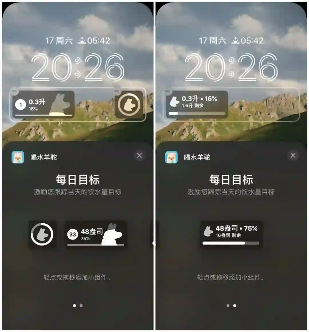 今年刚获得 Apple 设计大奖提名的喝水羊驼是一款专注于喝水提醒的工具,在 iOS 16 上它也适配了锁屏界面的小组件。