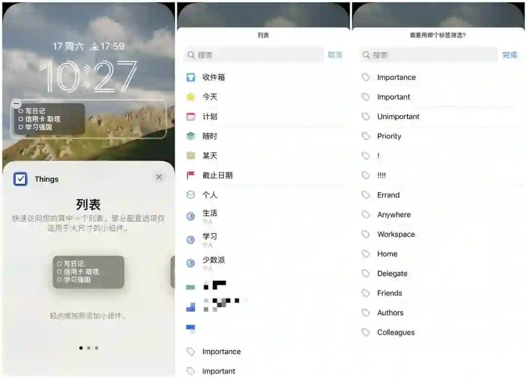 列表小组件可以让我在锁屏界面上直接浏览制定列表中的待办事项,也可以通过点击快速跳转访问该列表。点击锁屏上的小组件,我可以选取列表以及筛选的标签,满足自己更多的查看要求。