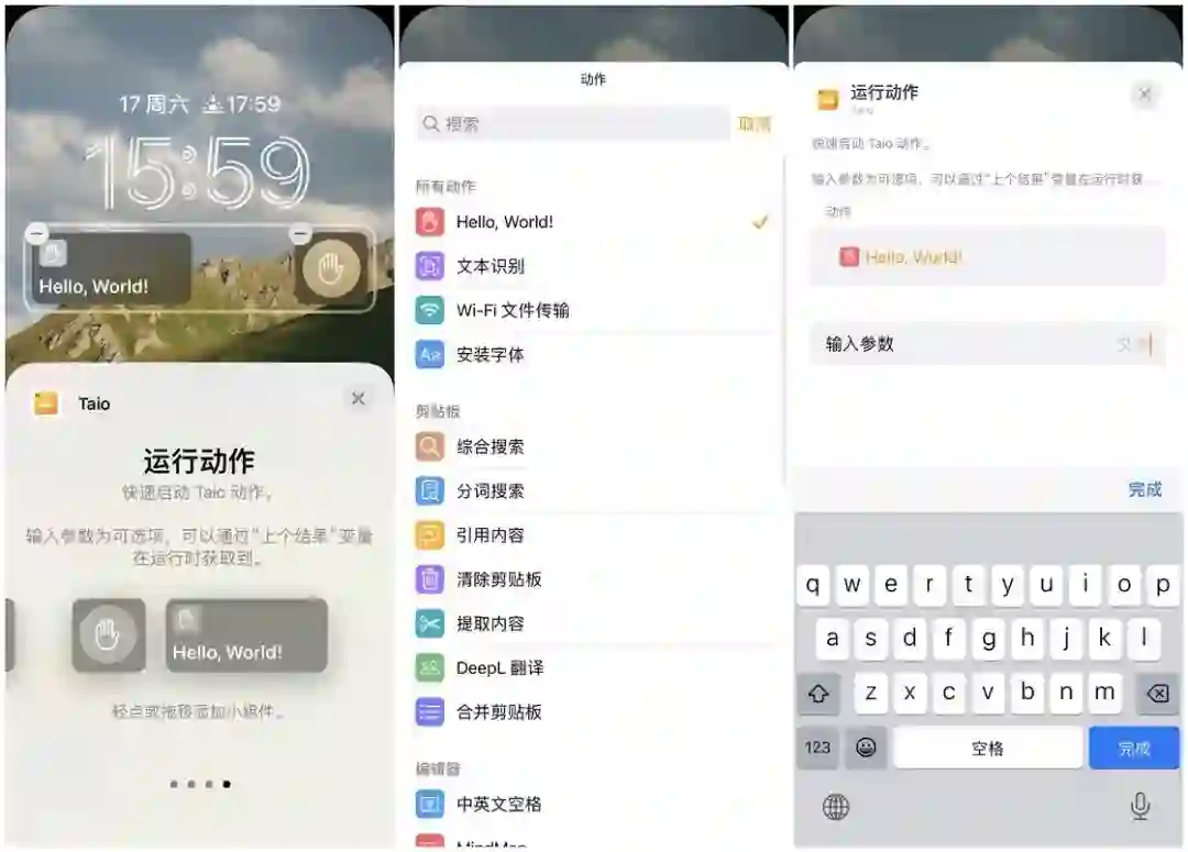 Taio 是一款集合了 Markdown 编辑器、剪贴板管理、快捷动作等多种功能的工具,然而它的锁屏界面小组件功能简单明了,分为了快捷草稿、新建文档、搜索文件和运行动作四种类型,每个类型又提供了大、小两种尺寸。
