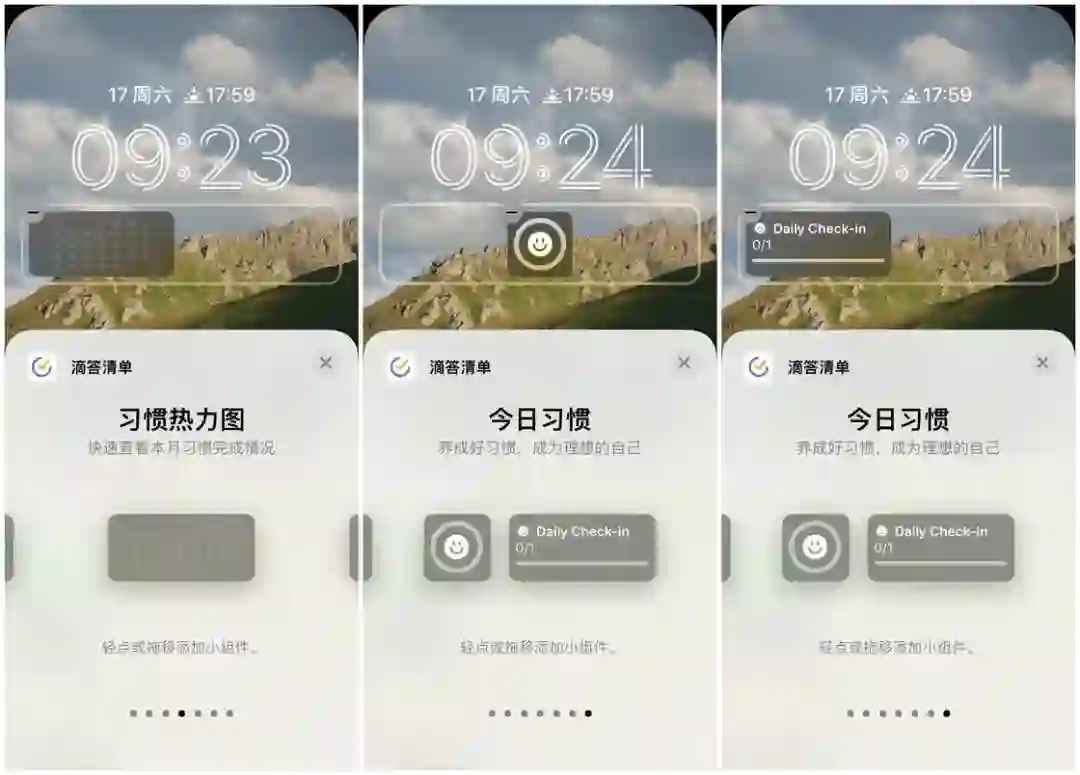 习惯部分,滴答清单提供了一种习惯热力图和两种今日习惯锁屏小组件。习惯热力图小组件展示了当前自然月内的习惯完成情况,而小的今日习惯小组件可以通过点击直接跳转到滴答清单的习惯打卡界面,大的今日习惯小组件则展示了当日的习惯打卡进度。