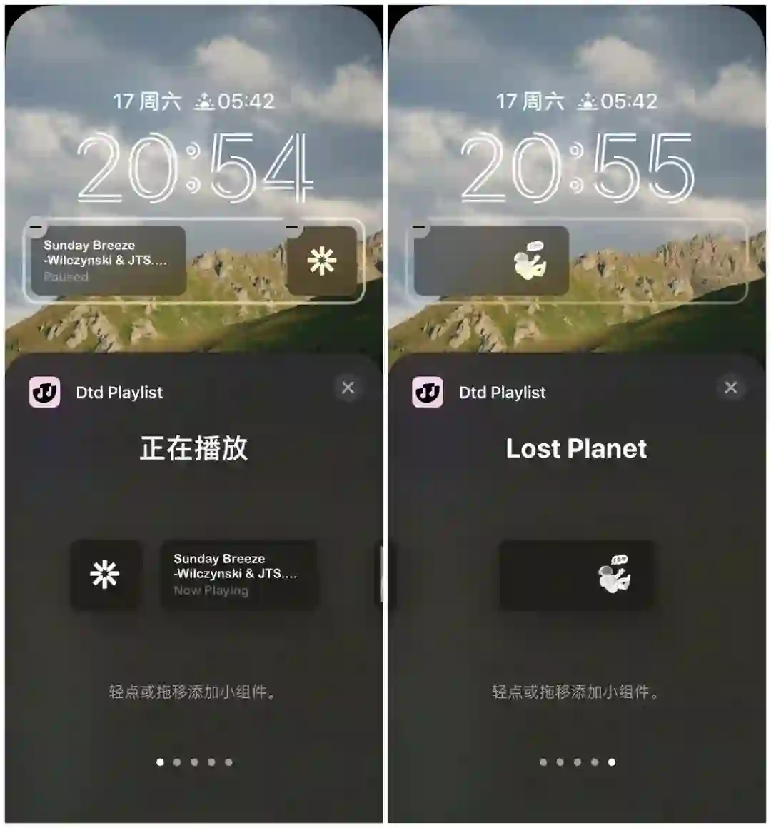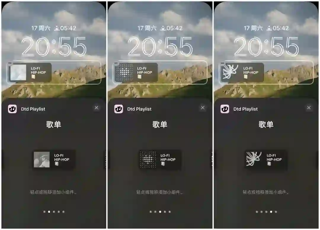 Dtd Playlist 的锁屏界面小组件提供了三种类型,分别为正在播放、歌单和 Lost planet。正在播放小组件有大、小两种尺寸,而 Lost Planet 小组件似乎就是个装饰作用,有发现用途的朋友麻烦在评论区告诉我。