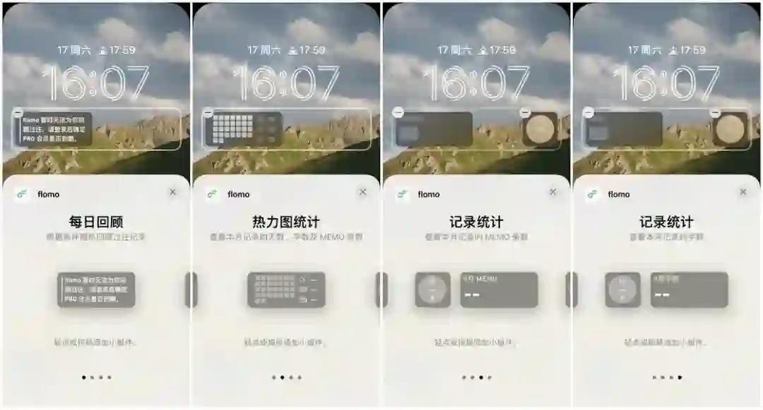 flomo 的锁屏界面小组件分为了每日回顾、热力图统计、记录统计三种类型,记录统计又分为统计 MEMO 条数和记录字数两种。