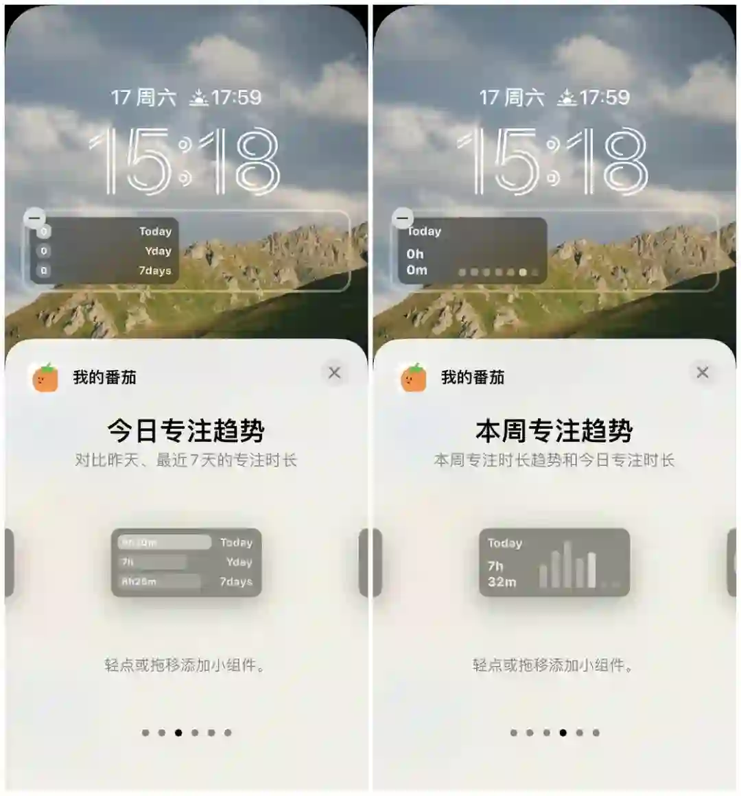专注时长小组件可以查看今日和本周的专注时长,在设置中开始自定义显示的标签。