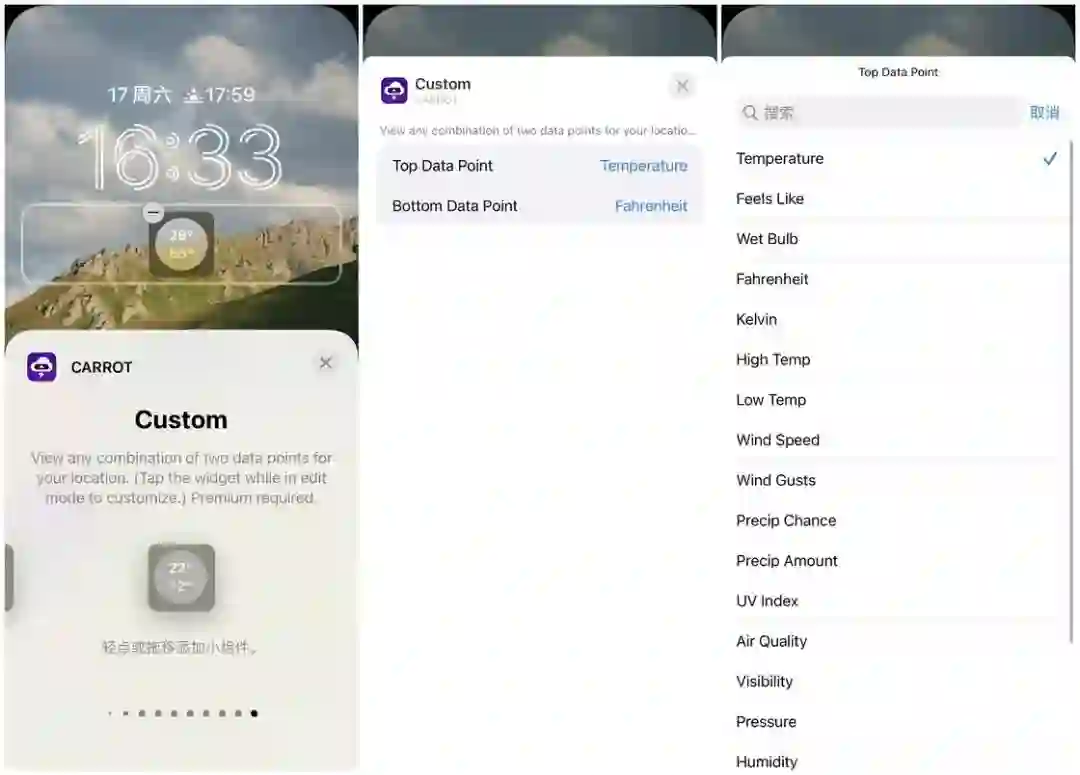 自定义小组件则可以自由地选择两个天气指标来组成,满足天气控们更加进阶的需求。