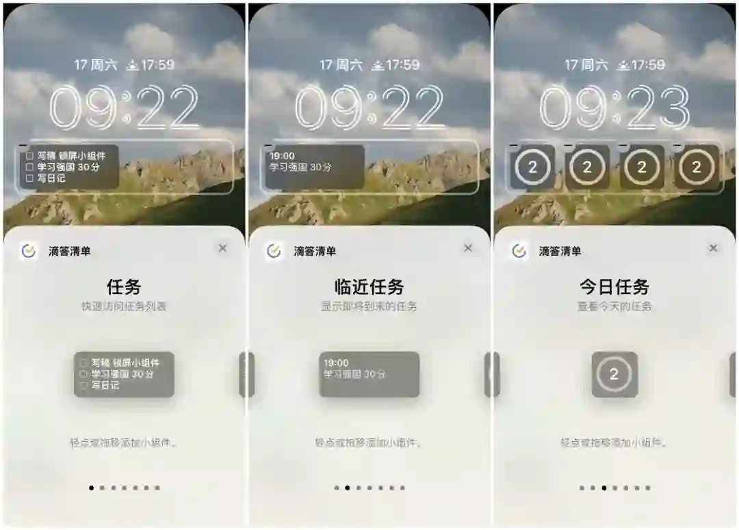 任务部分,滴答清单提供了任务(快速访问任务列表)、临近任务(现实即将到来的任务)和今日任务(查看今天的任务数量)三种锁屏小组件,对于滴答清单的用户来说可以在锁屏界面上看到这些信息非常有用,省去了解锁屏幕这一步骤。