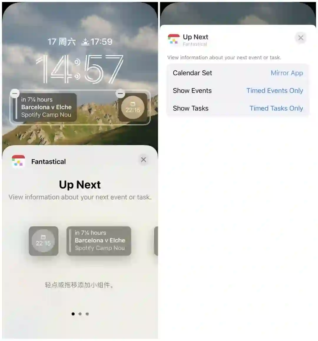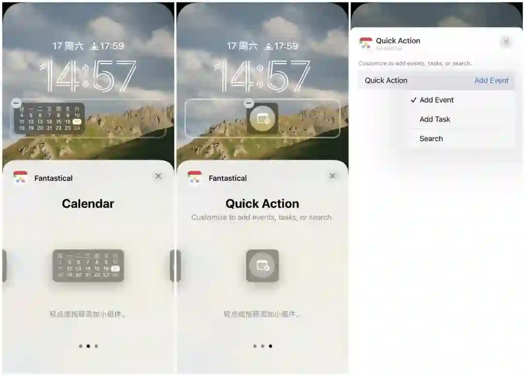 另外一款老牌的时间管理工具 Fantastical 也适配锁屏界面的小组件特性,并分为了 Up Next、Calendar 和 Quick Action 三种类型。