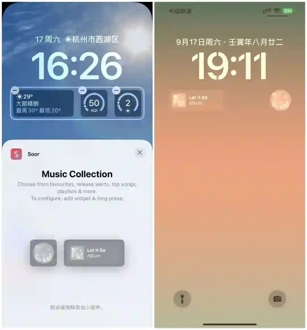 Soor 只提供了一种锁屏界面的小组件,不过可以通过长按小组件来将其设置为不同的展现形式,包括了最爱音乐、发行提醒、最受欢迎歌曲、歌单等。另外,Soor 也提供了大、小两种尺寸的小组件。