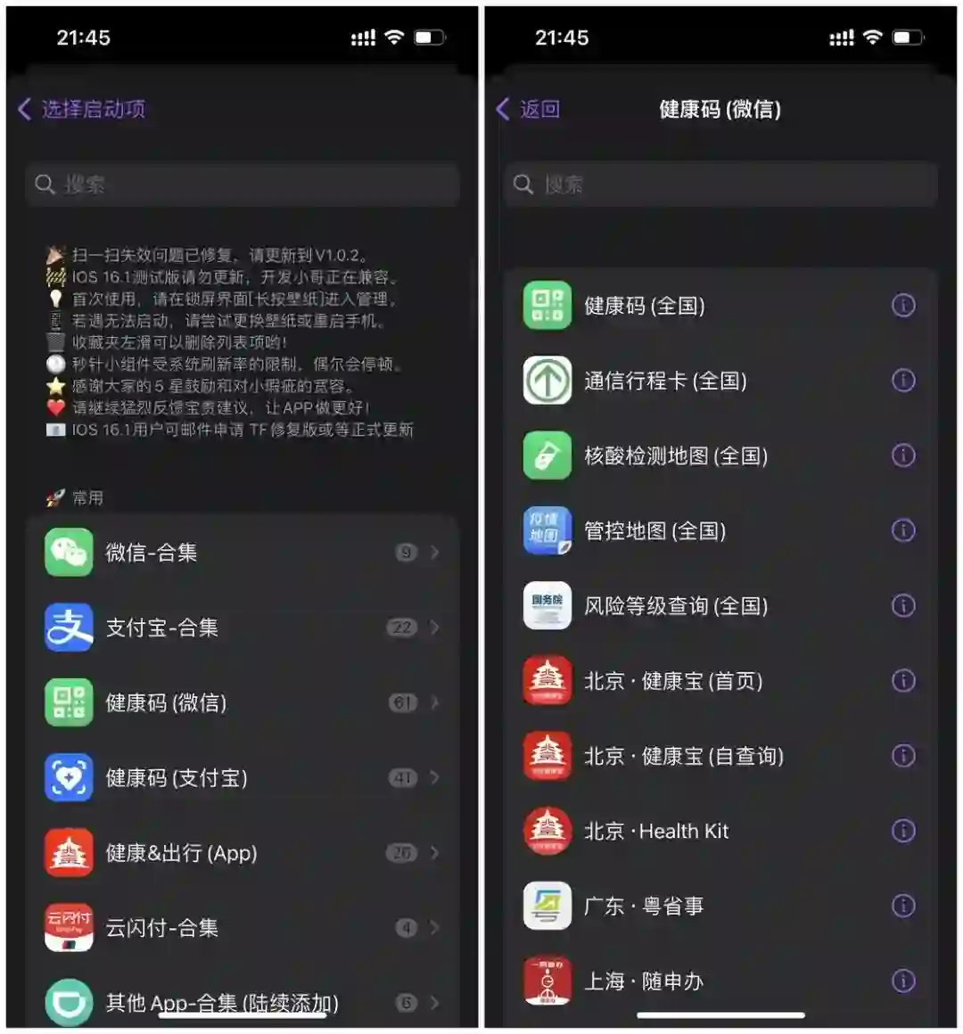 自定义功能的小组件可以实现 4 种不同的功能,其中我最喜欢的是各种第三方 App 的内置功能,比如说微信、支付宝、云闪付等,还可以添加健康和出行相关的各种功能。