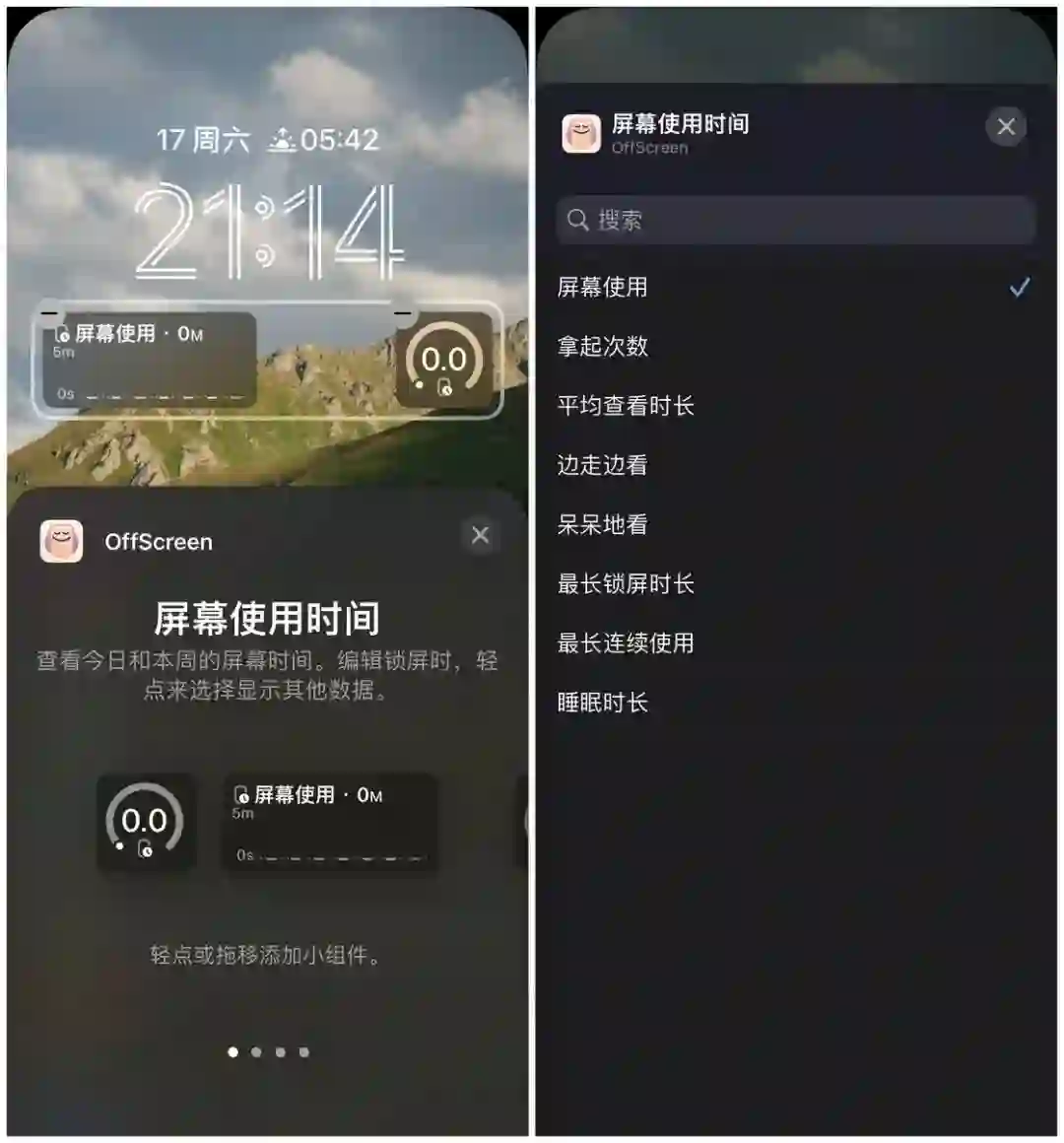 屏幕使用时间小组件不仅仅可以显示屏幕使用时间的数据,还可以选择拿起次数、平均查看时长、边走边看、呆呆地看等数据。