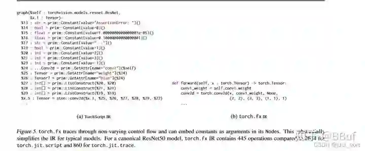 torch.fx的一个目标就是简化深度学习模型产生的IR,下面的Figure5以ResNet50为例展示了TorchScript IR和torch.fx IR的差别,相比于TorchScript IR,torch.fx IR确实简单并且可读性更强。
