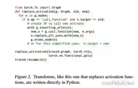 Figure2展示了使用 torch.fx 进行变换的示例。变换是找到一个激活的所有实例并将它们替换为另一个。在这里,我们使用它来将gelu 替换 relu。