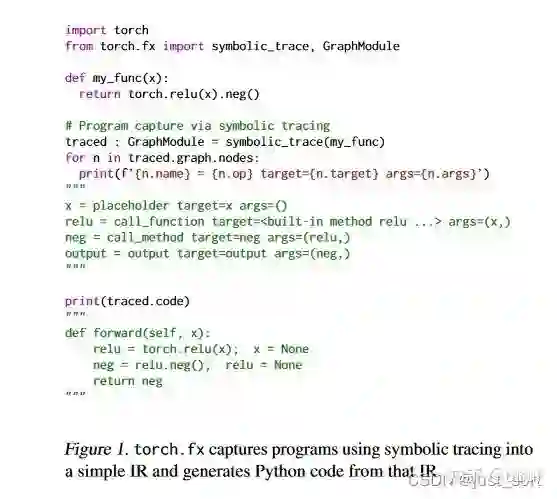 Figure1给我们展示了使用torch.fx.symbolic_trace捕获程序的例子,输入可以是一个torch.nn.Module或者函数,并且捕获之后的结构被存在一个Graph对象里面。该Graph对象和GraphModule中的模块参数相结合,GraphModule是 torch.nn.Module 的子类,其 forward 方法运行捕获的 Graph。我们可以打印此图的Nodes以查看捕获的 IR。placeholder节点表示输入,单个output节点表示Graph的结果。call_function 节点直接引用了它将调用的 Python 函数。call_method 节点直接调用其第一个参数的方法。Graph 被重组为 Python 代码(traced.code)以供调用。