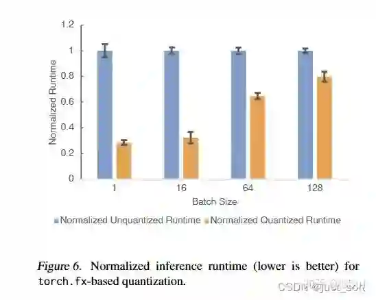 我们知道后量化以及量化感知训练可以提示程序推理时的性能,下面的Figure6就展示了基于torch.fx实现的后量化(使用FBGEMM量化算子)应用在DeepRecommender模型之后,在Intel Xeon Gold 6138 CPU @2.00GHz上的性能表现。基于torch.fx实现的后量化模型推理速度相比float类型的模型要高3.3倍。并且基于torch.fx实现量化操作相比基于TorchScript IR要简单很多。