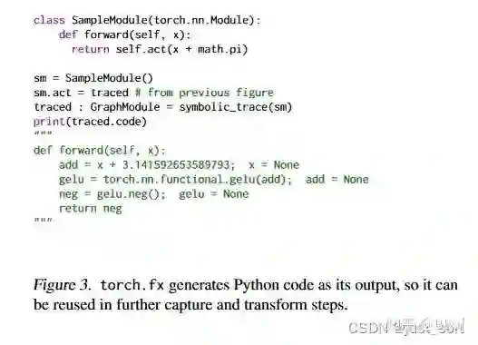 torch.fx 变换pipline的最后阶段是代码生成。torch.fx 并不是退出 Python 生态系统并进入定制的运行时,而是从变换后的 IR 生成有效的 Python 源代码。然后将此变换后的代码加载到 Python 中,生成一个可调用的 Python 对象,并作为forward方法安装在 GraphModule 实例上。使用代码生成允许将 torch.fx 变换的结果安装在模型中并用于进一步的变换。例如,在图3中,我们拿到trace原始程序的结果并将其安装为新模块中的激活函数。