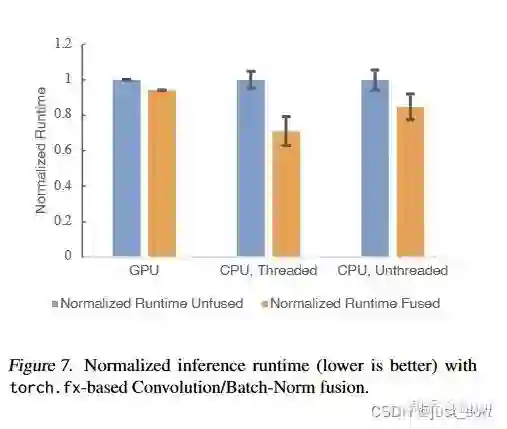 torch.fx还可以做Op融合,Figure7展示了基于torch.fx做了Conv+BN融合后应用在ResNet50上,在n NVIDIA Tesla V100-SXM2 16GB with CUDA version 11.0 和 Intel Xeon Gold 6138 CPU @ 2.00GHz的性能表现,可以看到在GPU上减少了约6%的latency,在CPU上减少了约40%的latency(多线程)和约18%的latency(单线程)。
