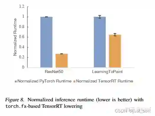最后,torch.fx在runtime阶段还支持通过ASIC加速(即将torch.fx中的算子lowering到对应的ASIC上),下面的Figure8展示了基于torch.fx推理ResNet50和LearningToPaint并将算子lowering到TensorRT之后的加速情况: