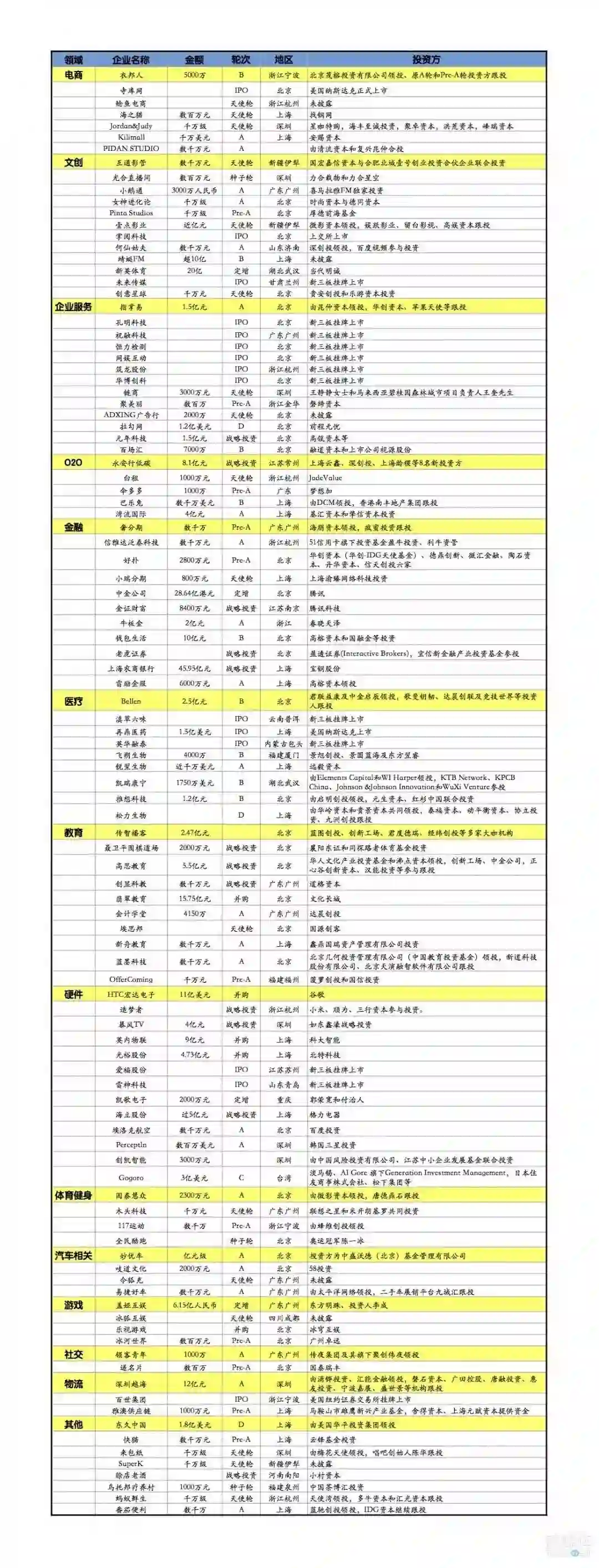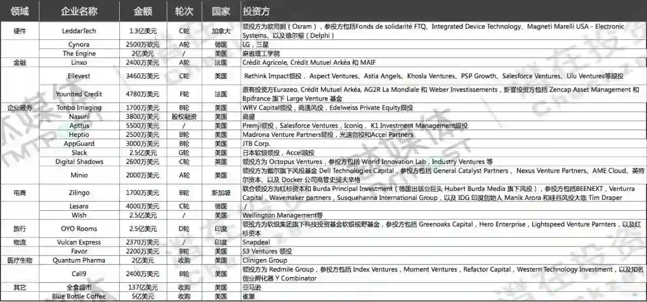 具体领域分布如下:企业服务8起,电商,金融,硬件各3起,物流,医疗生物各2起,旅行1起,其它2起。