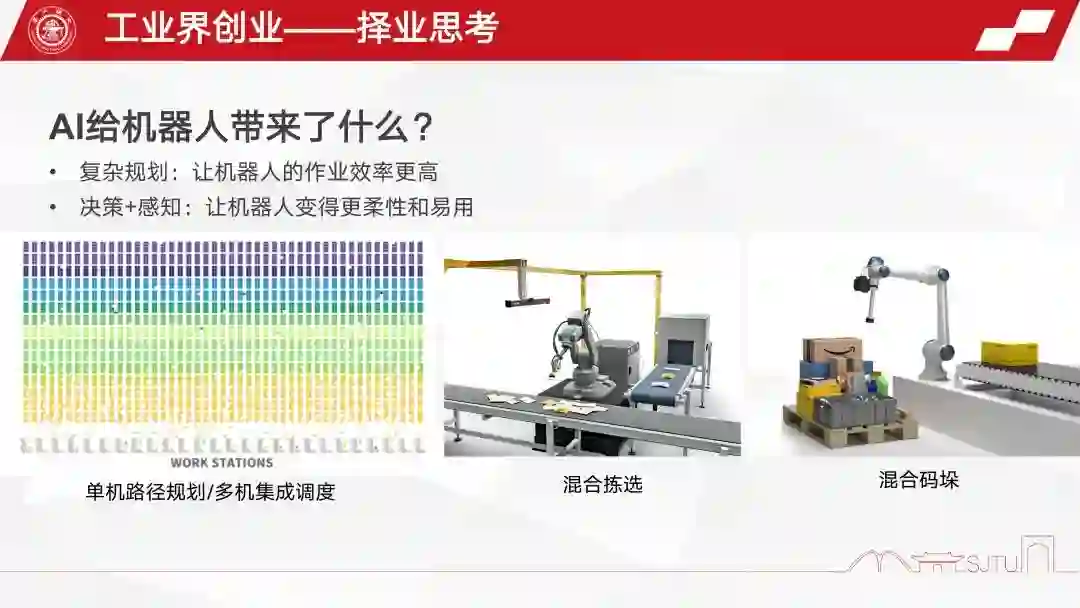 这块是不是就完美的符合了我自己的想象?然后当时我就去找,发现其实 工业界+机器人+创业 这个方向本来就有,大多是做一些比较传统的方案机器人。那么加了 AI 之后, AI 给机器人带来什么?我觉得 AI 给机器人主要带来了两个方面的提高,第一个就是复杂规划,就是它能够让机器人本身的效率变得更高。第二个话是它的决策和感知功能可以让机器人更柔性,易用性更强。