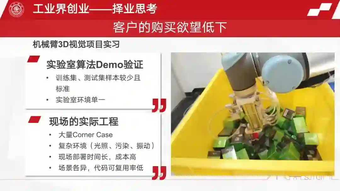 所以当时我就做了一个很深刻的检讨,机器人+工业界+创业+ AI 的这条路是不是行得通?AI 是不是真的有市场。