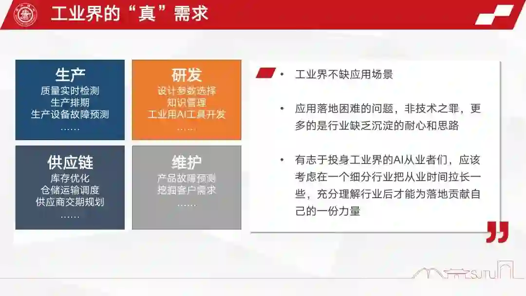 在生产端,你比如说做质量的实时检测、生产排期,然后以及生产设备的故障预测;然后研发端的话,像刚才说的那个设计参数的选择,知识管理以及一些工业用的 AI 工具的开发;供应链方面的话,比如说仓储优化,库存优化,供应商交期规划;维护方面其实也可以做到很多产品故障预测,挖掘客户需求等。