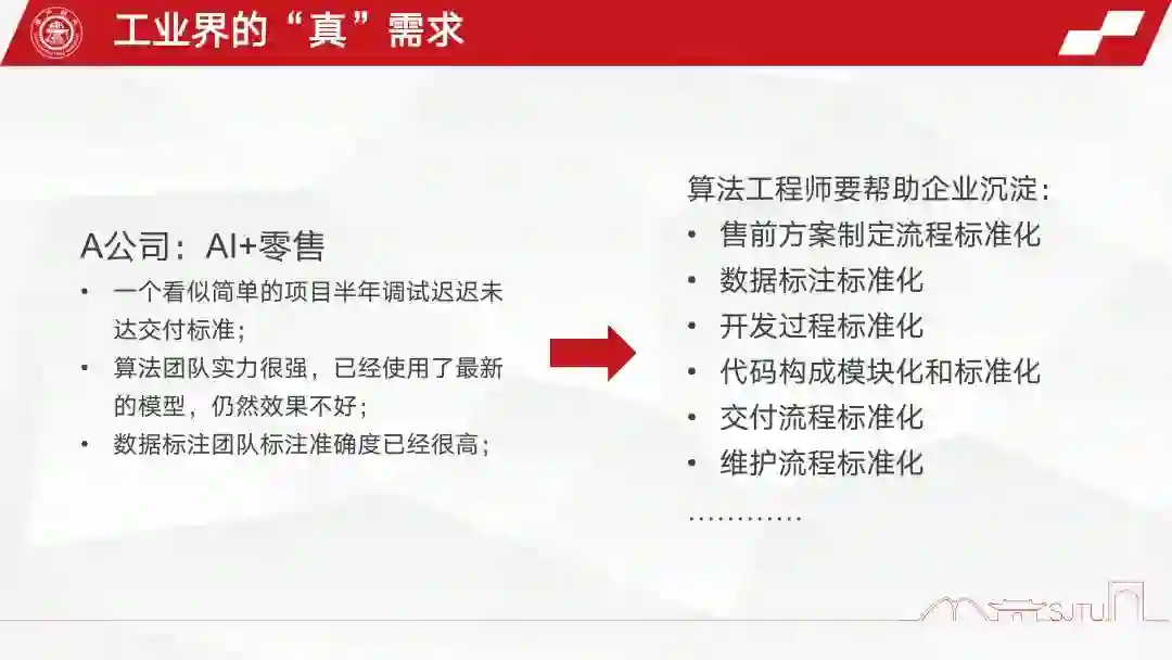 所以,我感觉算法工程师在公司里干完领导布置的工作外,其实还有很大的空间去帮整个上下游,包括从销售到标注,到软件开发,到算法以后的交付做标化沉淀。算法工程师是这个公司里面可能唯一一批懂得AI怎么用的人,其实是要去帮助其他人用好、用对AI,去帮助企业沉淀这件事情的。也就是说把前面的东西都标准化、流程化,比如说售前方案、数据标准化,开发过程标准化以及交付流程的标准化,否则这些事情全部都会落到算法工程师的头上。你就会看到很多算法部门的人在现场调代码,非常累也非常没有价值,这些东西理应沉淀下来以后,更低成本地做。
