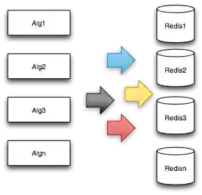 通常而言,客户端每个用户请求都会触发多个算法。一方面,每个算法都会召回几十甚至几百个团购或者商家ID,团购和商家基础属性被均匀地分配到几十台Redis里面(如下图),产生了大量的Redis请求,极端情况下,一次客户端请求所触发的团购基础数据请求就超过了上千次;另一方面,用户特征属性信息有十几种,每种属性也由单独的服务提供,服务端网络调用次数暴增。在一段时间里,很多系统都进入了多次请求杠杆反模式,Redis服务器的网卡经常被打死,多次进行扩容,提高线程池线程数量,丝毫没有改善。