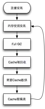 为了降低响应时间,系统往往在本地内存中缓存很多数据。缓存数据越多,命中率就越高,平均响应时间就越快。为了降低平均响应时间,有些开发者会不加限制地缓存各种数据,在正常流量情况下,系统响应时间和吞吐量都有很大改进。但是当流量高峰来临时,系统内存使用开始增多,触发了JVM进行full GC,进而导致大量缓存被释放(因为主流Java内存缓存都采用SoftReference和WeakReference所导致的),而大量请求又使得缓存被迅速填满,这就是反复缓存。反复缓存导致了频繁的full GC,而频繁full GC往往会导致系统性能急剧恶化。典型恶化流程图如下图: