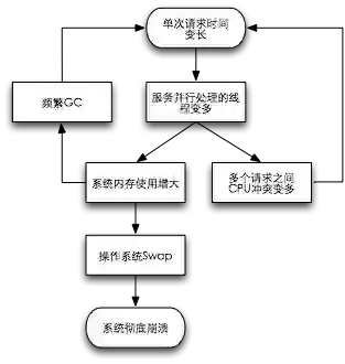 这是一种单次请求时延变长而导致系统性能恶化甚至崩溃的恶化模式。对于多线程服务,大量请求时间变长会使线程堆积、内存使用增加,最终可能会通过如下三种方式之一恶化系统性能: