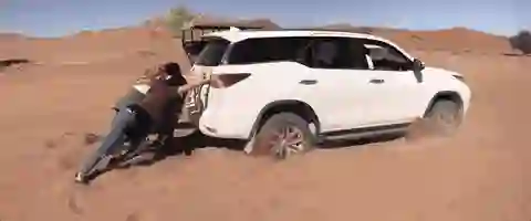 整个短片中,大马克最喜欢的镜头是车子陷在沙地里大家一起推车的一段。当时他们正行驶在纳米比亚的红沙漠里,从公路的尽头延伸出一段沙路,这段路只允许四驱越野车进入,但即使是符合条件的车辆也容易陷进沙里。