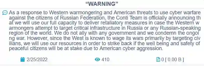 在2022年2月25日,Conti勒索软件团伙为了表明自己的立场,还发布了一篇博客文章,宣布他们将全力支持俄罗斯政府对乌克兰的攻击。他们还警告地说,如果有人组织了针对俄罗斯的网络攻击,Conti团伙将围绕关键基础设施进行反击。
