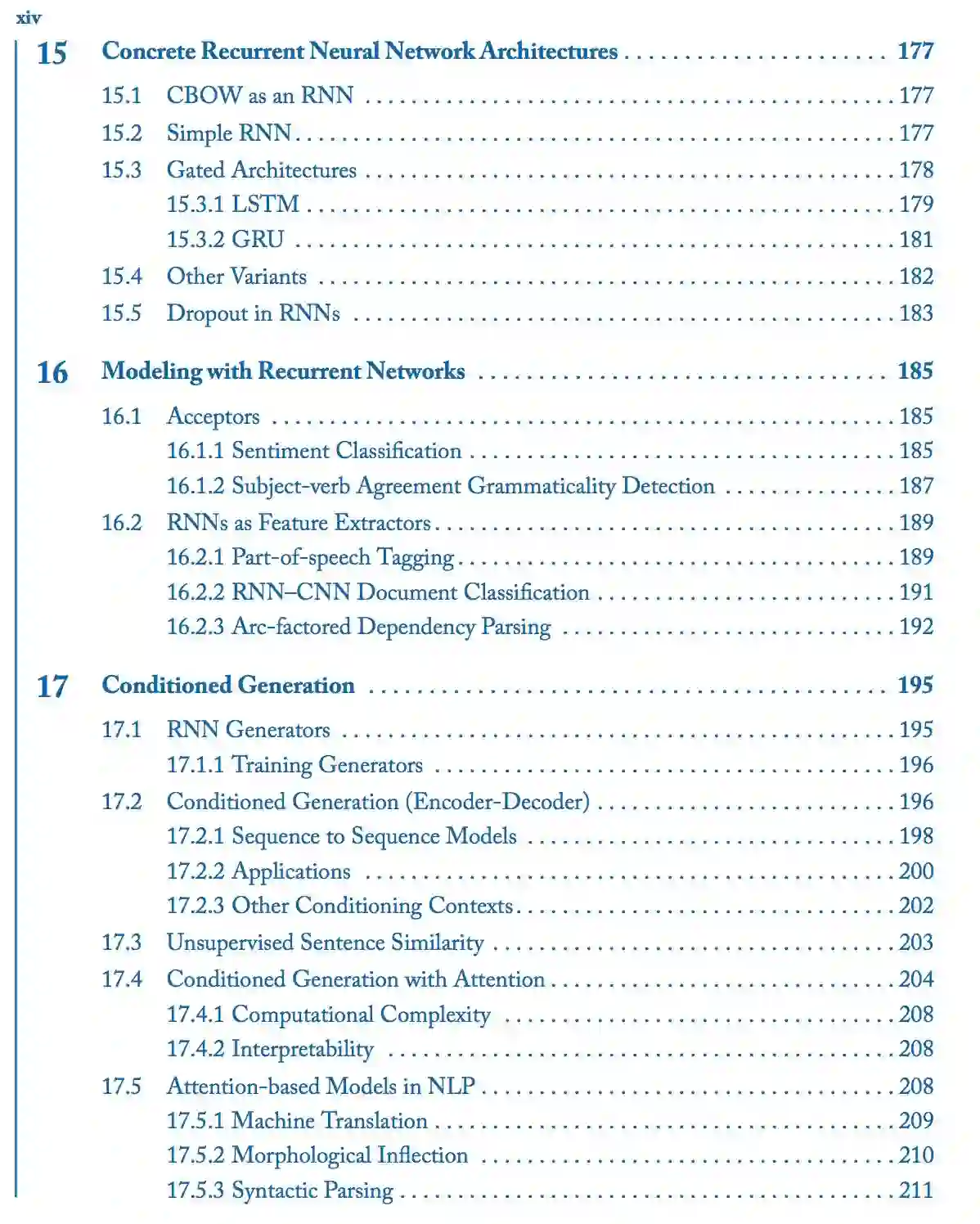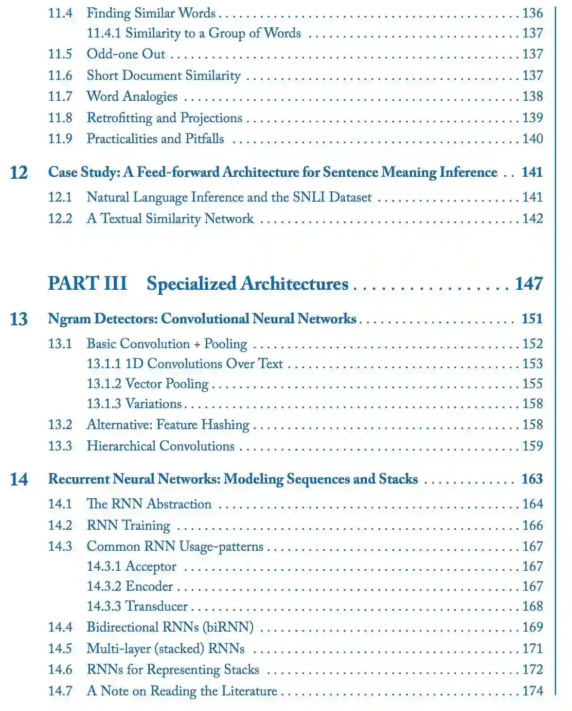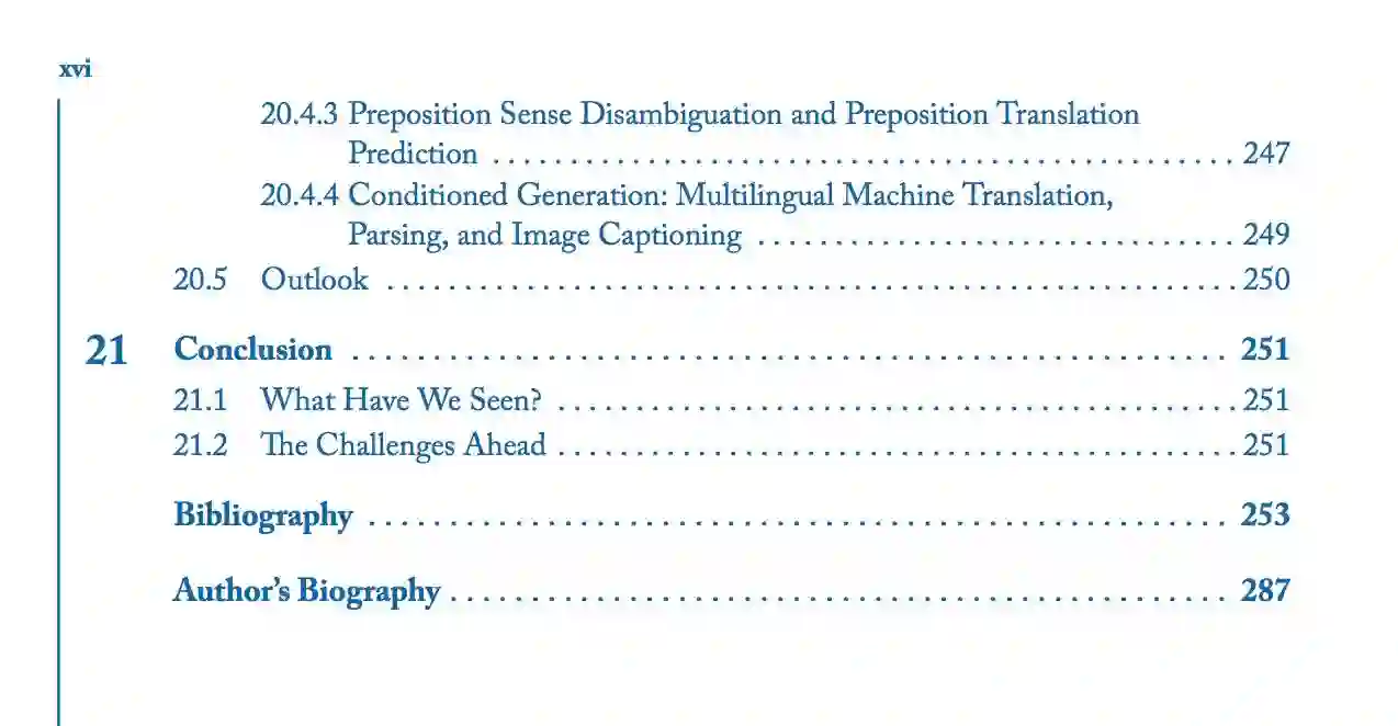 本书的后半部分(第三部分和第四部分)介绍了更多的专门的神经网络架构,包括 1D 卷积神经网络、循环神经网络、条件生成模型和注意力模型。这些架构和技术是机器翻译、句法分析和其他许多应用程序背后最先进算法的推动力。最后,我们还讨论了树形网络、结构化预测和多任务学习的前景。