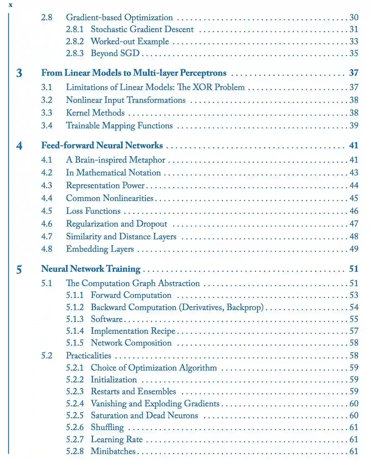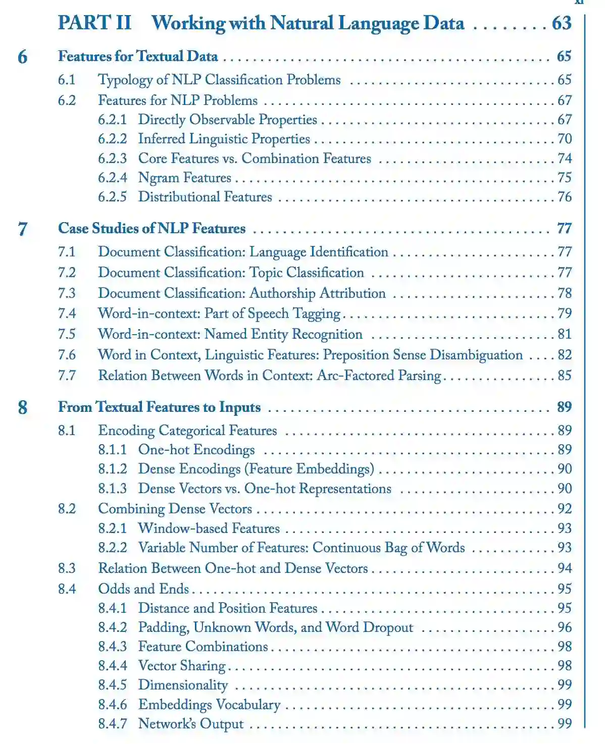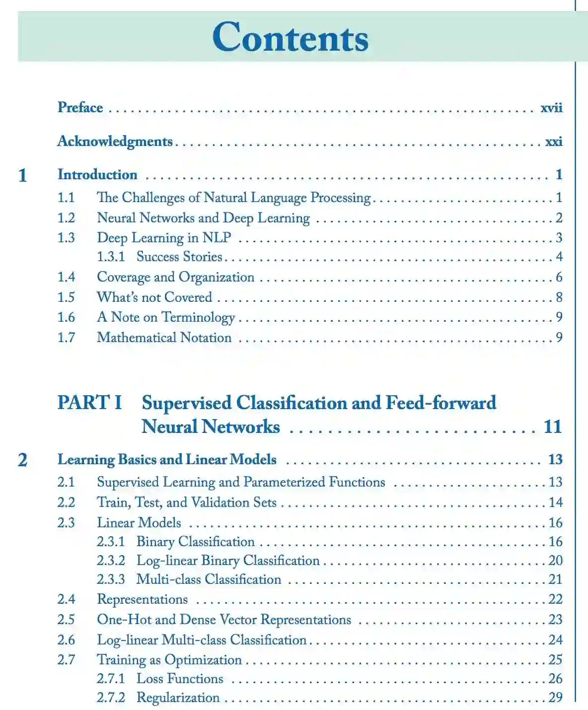本书的后半部分(第三部分和第四部分)介绍了更多的专门的神经网络架构,包括 1D 卷积神经网络、循环神经网络、条件生成模型和注意力模型。这些架构和技术是机器翻译、句法分析和其他许多应用程序背后最先进算法的推动力。最后,我们还讨论了树形网络、结构化预测和多任务学习的前景。