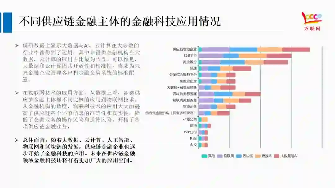 总体而言,随着大数据、云计算、人工智能、物联网和区块链的发展,供应链金融企业也逐步开始了金融科技的应用。未来在供应链金融领域金融科技还将有着更加广大的应用空间。