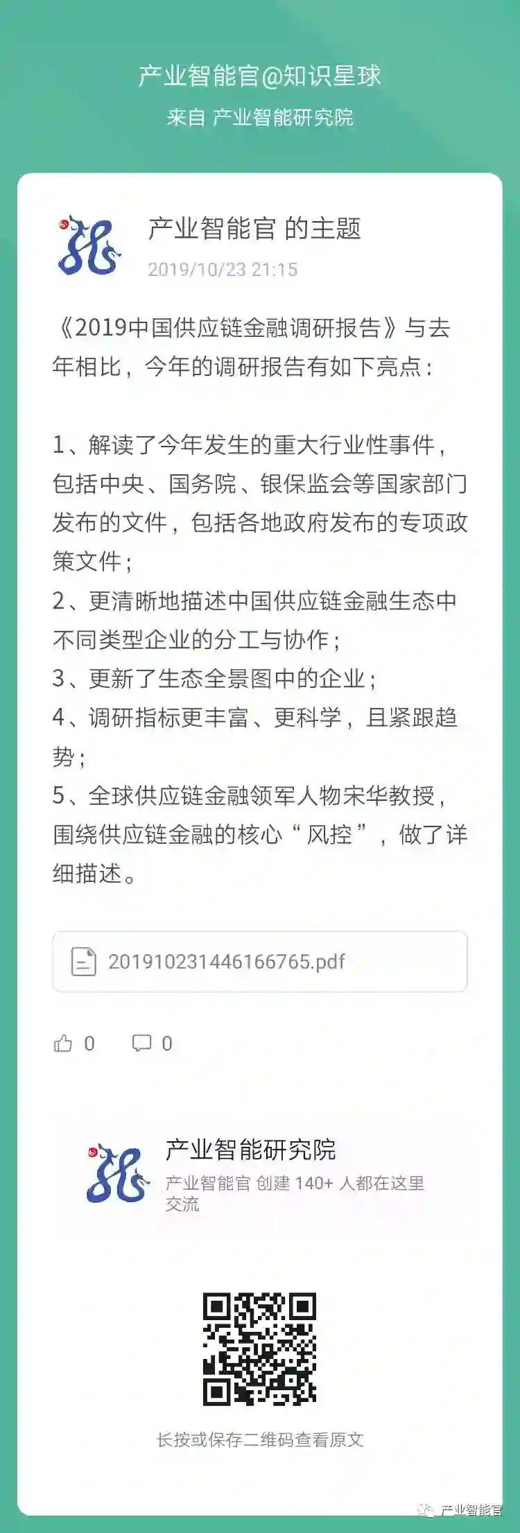 《2019中国供应链金融调研报告》从2019年7月开始,历经3个月,报告梳理了2019年中国供应链金融的发展大环境、生态、企业发展现状、发展大趋势,以数据洞悉当前供金行业市场特点、产品、风控、科技及资金融通变化,以兹与时俱进地为广大同仁梳理当前中国供应链金融的发展情况,致力于促进中国供应链金融的繁荣、健康发展。