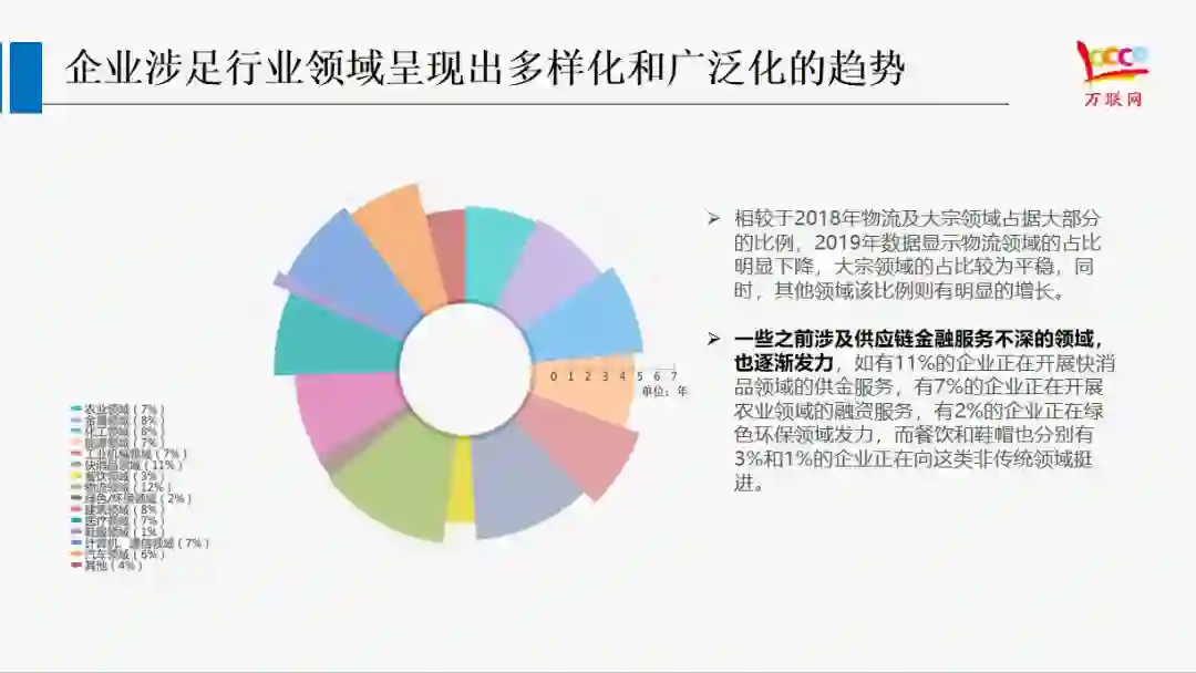 一些之前涉及供应链金融服务不深的领域,也逐渐发力,如有11%的企业正在开展快消品领域的供金服务,有7%的企业正在开展农业领域的融资服务,有2%的企业正在绿色环保领域发力,而餐饮和鞋帽也分别有3%和1%的企业正在向这类非传统领域挺进。