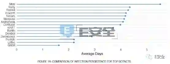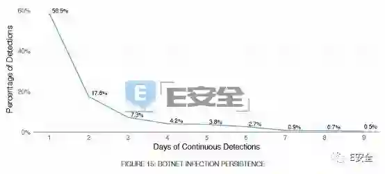 58%的僵尸网络感染持续时间不足一天;17.6%的僵尸网络感染持续了两天;7.3%的僵尸网络感染持续了三天;只有5%的僵尸网络感染持续了一周以上。