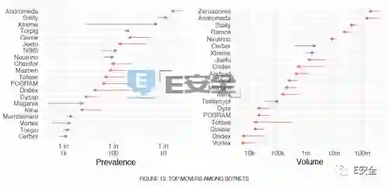 Mirai 僵尸程序的平均寿命为5.5天,紧随其后的僵尸网络包括 Sality(垃圾邮件和代理恶意软件)、Ramnit(银行木马)、H-worm(下载器)、Necurs(垃圾邮件)等,具体见下图: