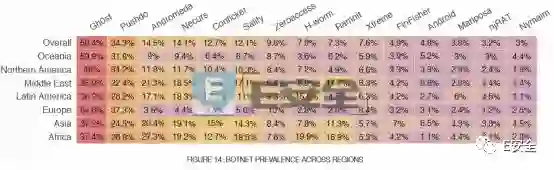 Fortinet 指出,尽管 Mirai 感染的平均持续较长,但它并不是最出众的僵尸网络。2018第一季度,Gh0st 才是目前为止感染最广泛的僵尸网络恶意软件,其次是 Pushdo 垃圾邮件僵尸网络和 Andromeda 僵尸网络。