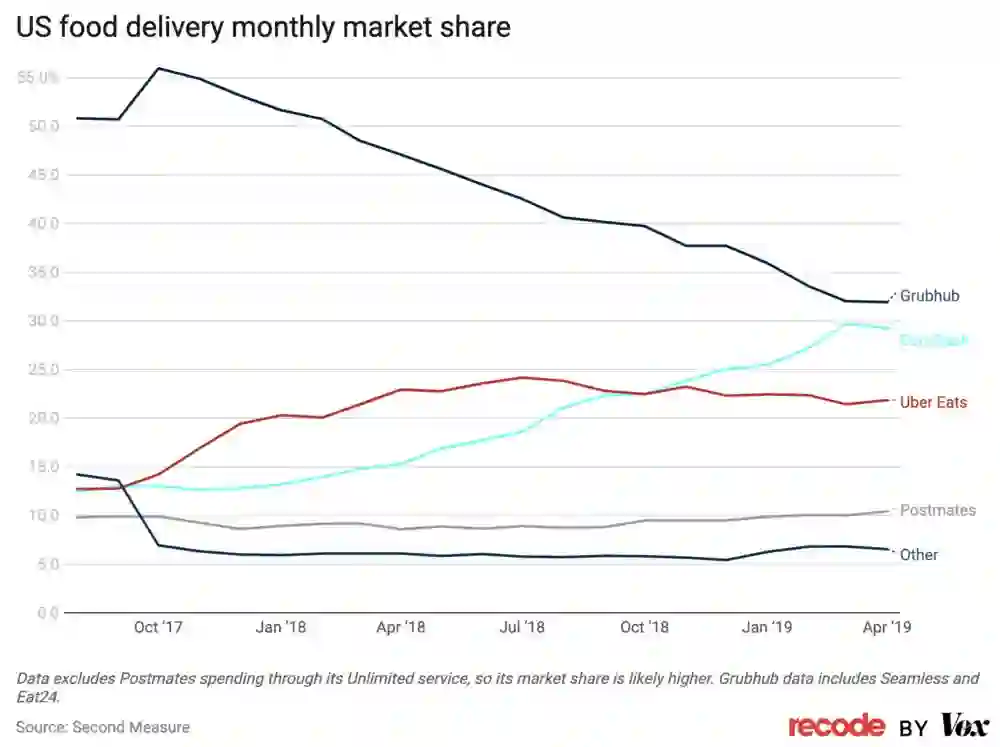 经过外媒统计,过去一年,美国的外卖市场有着爆发性的增长。就在今年5月份,DoorDash平用32%的成交额份额超过了GrubHub,拿走了第一的位置。(GrubHub的份额为31.7%。)该月,DoorDash的同比增长了189%。Uber Eats也才同比增长了32%,GrubHub仅为6%。