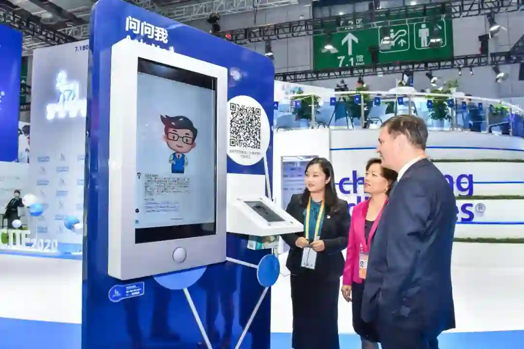 图为微软公司资深副总裁、微软大中华区董事长兼首席执行官柯睿杰与诺和诺德全球高级副总裁兼大中国区总裁周霞萍共同参观诺和诺德进博会展台,并与小诺老师进行互动