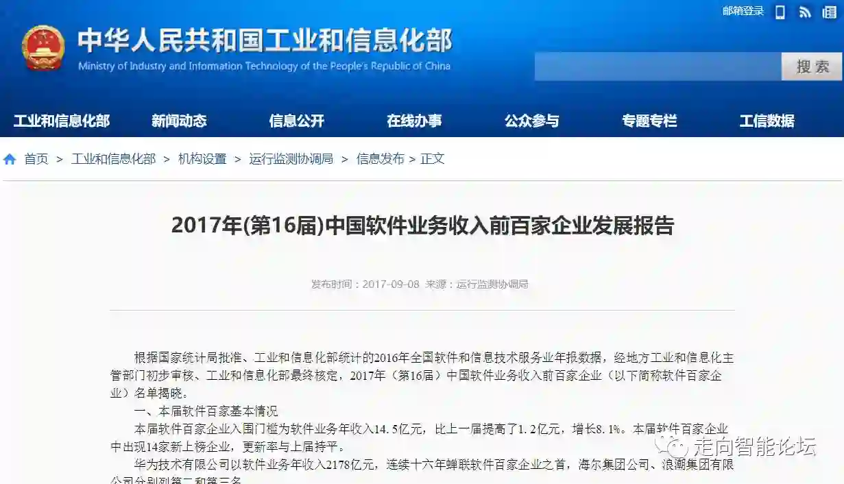 近日,工信部官网公布2017年(第16届)中国软件业务收入前百家企业发展报告,及企业名单。华为公司以软件业务年收入2178亿元,连续十六年蝉联软件百家企业之首,海尔集团公司、浪潮集团有限公司分别列第二和第三名。本届软件百家企业中出现14家新上榜企业。本文来自:工信部官网,小智整理,由《走向智能论坛》微信公众号推荐阅读。